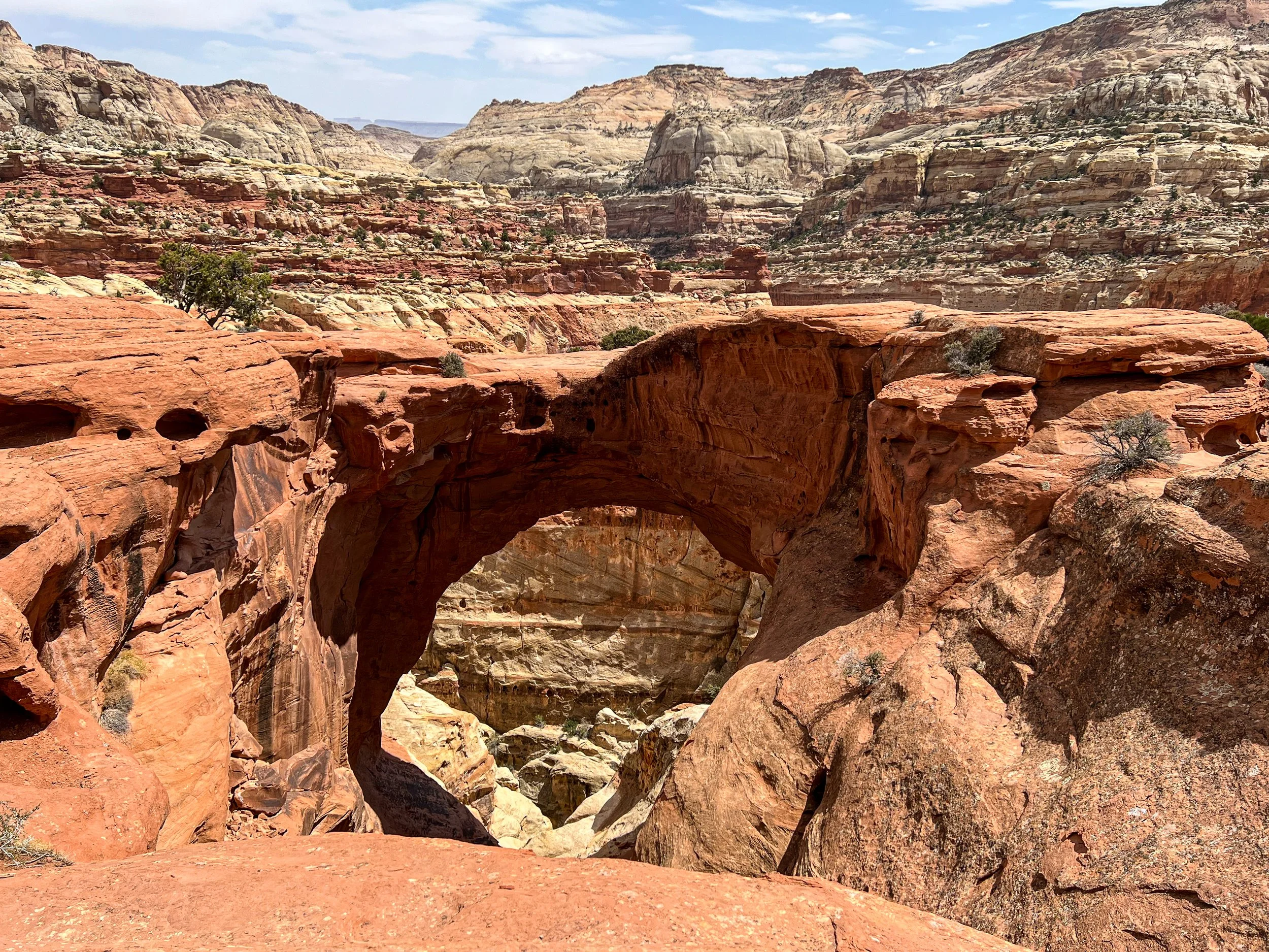 Capitol Reef is a spectacular National Park located in southern Utah. It is not as well know as its neighbors (Arches, Canyonlands, Bryce and Zion) but is similar in many ways. It has desert mountains, slot canyons, arches and a fascinating rock formation called Waterpocket Fold which runs almost 100 miles from the southern edge of the park to the North. Wterpocket Fold is considered a geologic monocline or a wrinkle on the earth that was a difficult barrier for early settlers to cross.