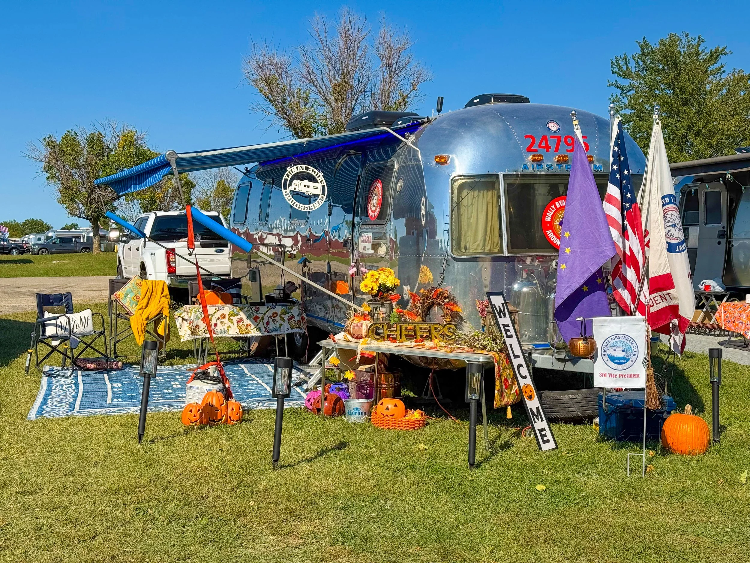 A vintage Airstream trailer decorated for Halloween.
